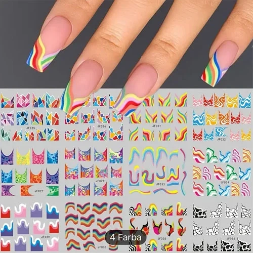 Samolepiace nálepky na nechty s krásnymi farebnými motívmi. Vyznačujú sa svojou jednoduchou aplikáciou. Sú ideálne na profesionálne zdobenie manikúry v salóne, ale aj doma. Balenie obsahuje mix farebných vzorov.